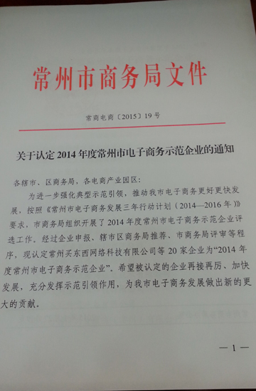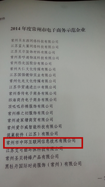 常州中环互联网2015年开年即获得“常州市电子商务示范企业”,这样的荣誉是对中环过去一年工作的肯定,同时也是中环2015年工作的不竭动力。