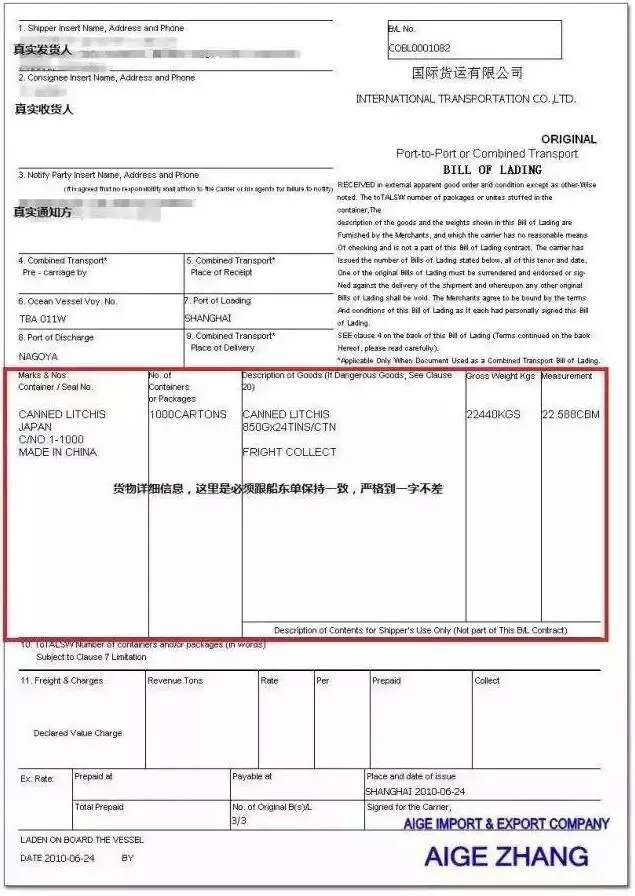 如同之前所说,一个完整物流流程,提单始终贯穿其中。而在一个出口流程中,有货代提单必然会有船东提单存在。通过以下两图,我们可以清晰看到,货代提单跟船公司提单有相关联的内容,就是货物详细信息这个部分。两份提单中的货物详细信息一栏,必须保持一致,严格到一字不差。