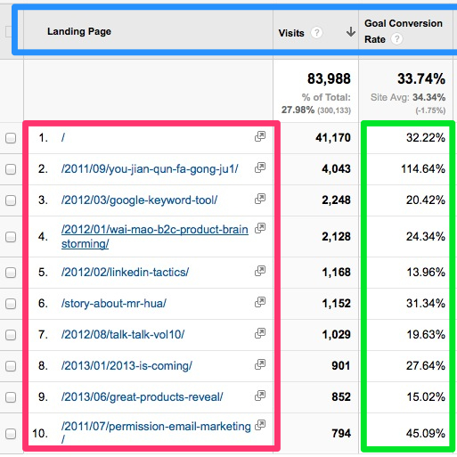 还有一种情况,我们可以通过Google Analytics里的比较功能,来把两个维度结合起来比较,比如说我们把直接流量的登陆页地址和实际询盘获取的比例结合起来分析,如下图,蓝色代表了三种维度,依次是:直接流量登陆页,访问次数,转换比例。 红色框子内就是具体的直接流量登陆页的地址URL, 绿色则是具体的转换率数字。从这些数字你可以看到哪个页面转换率最高,哪些页面转换率低,对于转换率高的页面我们可以尽量增加他的曝光度或者增加推广力度,而对于转换率低的则很明显我们需要去做网站的用户体验调整了。