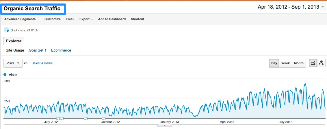 搜索流量(Search Traffic) 是指通过搜索引擎获取的流量,这包括了付费和免费的流量,掌握搜索流量的数据也是至关重要的,这些数据可以帮助你知道你所做的SEO效果如何,哪些地方可以加强,哪些地方是无用功,首先在Google Analytics工具中,我们可以看到我们网站的搜索流量在过去特定时间内的变化 (下图为米课从2012年4月到2013年8月的搜索流量变化)通过这个数据你可以大概知道你的网站的健康情况,当然这还只是一个Overview大体的数据,不过从中你也可以发现很多细节。比如某个时间段流量降低了,我们就可以就这个特定的时间段做更深的分析。