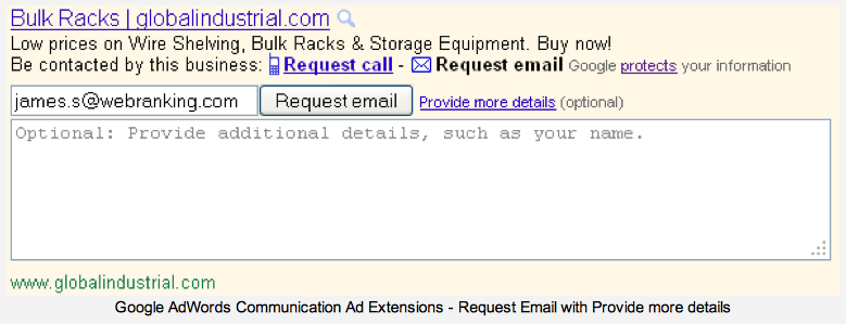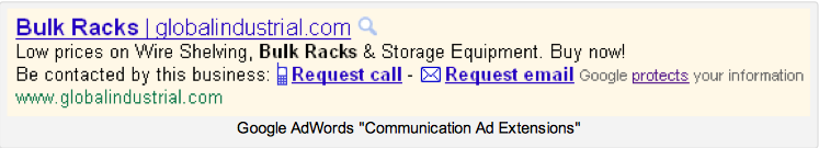 那么在adwords账户中除了可以设置常见的一些扩展外,Google还在测试一系列新的广告扩展,其中的Communication Extension就非常适合我们的外贸B2B企业使用,大家都明白外贸B2B网站的目的就是要获取Leads即询盘,由于他和外贸B2C平台的经营性质完全不同(后者注重Sales销售)所以这种Communication Extension就是完全为Leads打造的一种广告形式,让我们来看下图了解下这个扩展到底是神马东东。