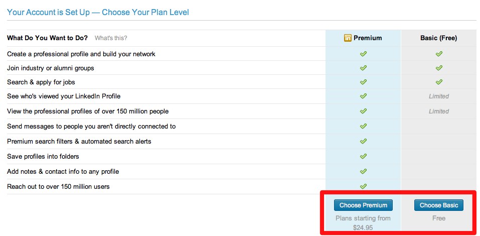 在你注册完账户之后,你会发现Linkedin有两种会员模式,一种是付费的一种是免费的,其中最大的区别也是最有用的区别就是付费的版本你可以发信息给不在你好友圈子里的用户,当你熟悉了怎么使用Linkedin之后,可以根据自己的实际情况来看是否要加入付费会员。