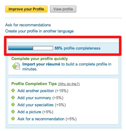 Linkedin为了保证用户的高质量,所以在注册成功之后,会要求你填写一些你的相关资料,其中最难完成的就是需要有人给你写些评语进行推荐,你需要三个会员给你写评论和推荐才算100%完成你的资料填写,当然完成之后也会带来更多的人加你。相信很多外贸SOHO一开始都不会有评价,那么想获得别人的推荐的唯一方法就是你先去主动给别人写评论了,直到有人给你写了为止。