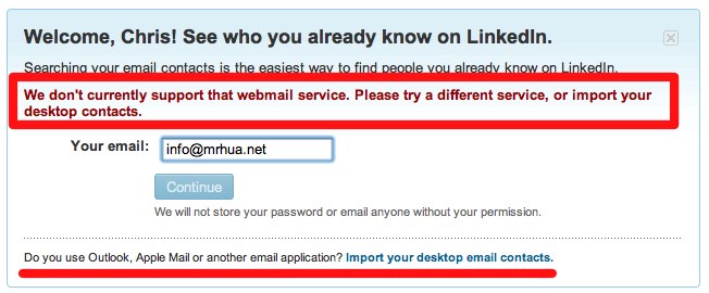 接下来一步很重要的事情,对于做外贸的人来说,你必须同步你平时和客户沟通的邮箱,Linkedin会自动检查所有和你交流过的人是否有注册过Linkedin,如果你已经做外贸很多年了,必然有很多有用的联系人,借这个机会把他们都加入关系网,一定会给你增加更多的机会。导入邮件的时候需要注意如果你用的不是常见邮箱如Gmail, MSN, AOL等,则需要通过导入文件的方式才可以进行。