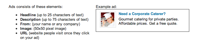从Linkedin广告投放的人群选择性来看,的确是更为精准,广告商可以选择投放到特定的职位,行业,地理位置,性别,公司以及Linkedin组群,也可以自由的组合各种属性。Linkedin广告的编辑其实和Adwords大同小异,唯一多了一个小图片: