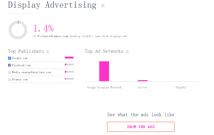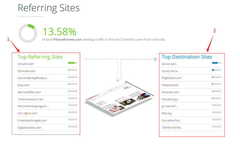 1. 表示3个月内引荐流量来源前10的网站,数据表示,网站总流量的13.58% 的主要来源是 amazon.com,写到这里才发现,我选择pictureframes.com 作为案例讲解就是个错误了,因为我并不擅长B2C,也不知道如何通过amazon来引流;
