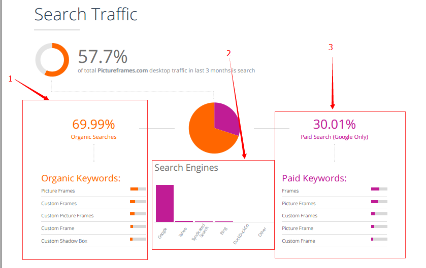 - Search(搜索流量):一般通过搜索引擎进入自身网站的流量,57.7%的总流量比例证明网站在搜索引擎的投入(外链建设,以及ppc的投入)相当大。具体在后面的数据中体现。