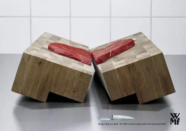 从上个分析中我们得到创意就是给人意想不到的效果,给人惊喜,而在广告的运用中,创意更是最核心的部分,如Scotch运用非常简单的画面,贴上胶带,就算把坚硬的图钉掰弯了都撕不下了,来比喻他们的产品质量超群,而wmf也是运用的相同的手法,一把小刀太过锋利导致把整张桌子都切成两半,也是用非常夸张的手法来强调他们产品的功能性,打破了固有的思维方式,给了消费者意想不到的结果,所以创意应该是,情理之中却是意料之外的。