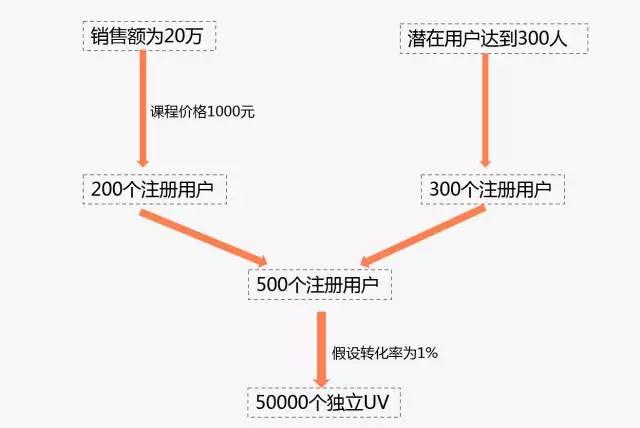 比如总目标:5月份销售额为20万,潜在用户达到300人。根据公式:销售额=UV*客单价*转化率。客单价是确定的,课程售价1000元,转化率根据网站平均转化率1%估算。此刻也可以使用反推法。