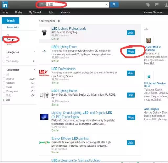 我们登陆页面后,可以通过产品进行搜索,会搜索出来很多我们想要的结果,然后选择GROUPS,我们会看到有view和join这两个词。一般选择view的先进去,其次点击join加入,然后就是耐心的等待审核。我以LED为例给大家示范下: