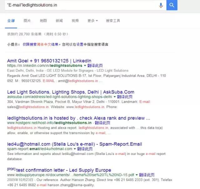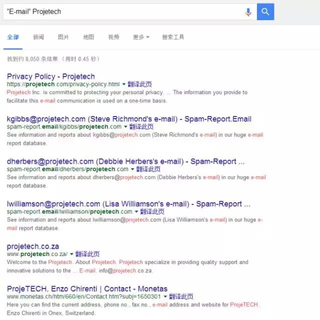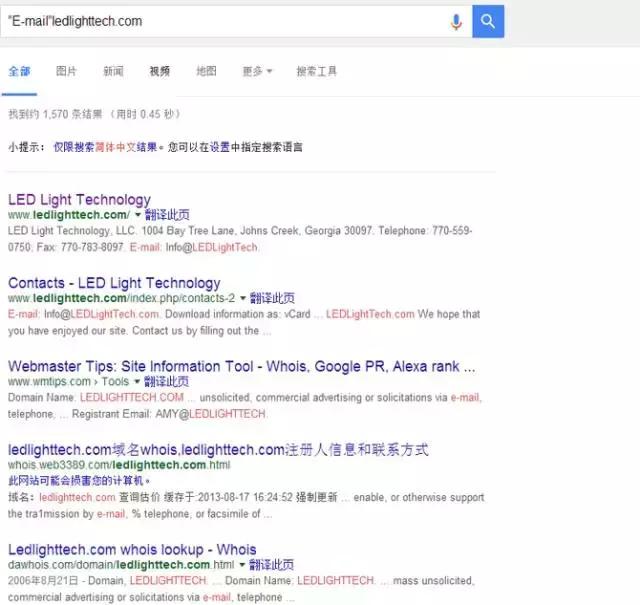 然后再用google 邮箱搜索的方法,搜索就可以找到他公司的邮箱,如下图所示: