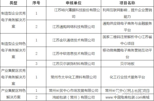 为贯彻落实市政府《常州市传统优势产业转型升级“双百”行动计划(2013-2015年)》(常政办法【2013】171号)精神,确保完成“双百”行动计划的电商目标,促进传统产业转型升级,树立企业开展电子商务应用典范和标杆,经企业申报、辖市区推荐、专家评审等程序,评选出制造型企业优秀电子商务解决方案2家、制造型企业特色电子商务解决方案3家、产业集聚区优秀电子商务解决方案1家、产业集聚区特色解决方案2家,现予公示。