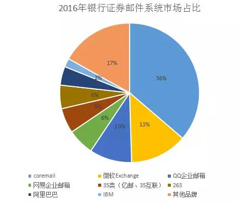 相比政府机构,银行证券机构在国产化和去IOE过程中相对较慢,因此微软和IBM等国外品牌依然占有一定比例,更倾向于选择有实力的品牌。Coremail、微软、腾讯、网易这些实力雄厚的品牌占去半壁江山,占比65%。