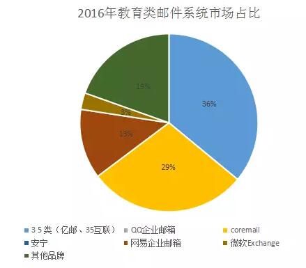 35类中的亿邮是国内较早进入教育行业的邮件系统,在中小院校中具有比较大的影响力。QQ企业邮箱因为链接QQ、微信,所以影响力也慢慢强大起来。Coremail邮件系统主要在985、211类高校具有比较大的占比,在百强高校中占去6成的份额。35类、QQ企业邮箱和Coremail邮件系统三大品牌占去了教育机构7成市场。