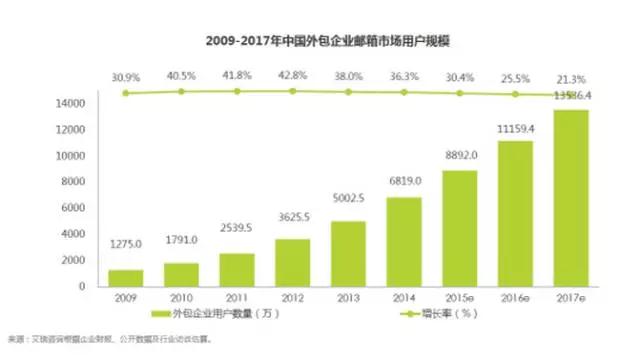 根据艾瑞相关报告分析及预测:2014年,中国企业邮箱用户规模仅为6000万左右,但到2016年底,中国企业邮箱用户规模将达到1.12亿,并且仍将持续高速增长,至2017年底,将有望达到1.35亿。可见,在企业办公应用中,电子邮件仍然发挥着不可替代的作用,并且其重要性正在逐年提高。