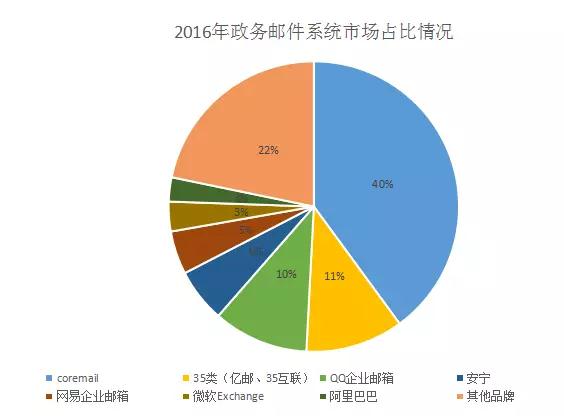 从上图可见,政府机构绝大部分采用国内邮件系统,微软Exchange只占3%。已知品牌中,Coremail邮件系统以40%领先,35类邮件系统包括亿邮、35互联两个产品,以11%紧跟其后。腾讯企业邮箱、网易企业邮箱以及阿里巴巴三大巨头凭借强大的品牌优势,也占有一定比例。