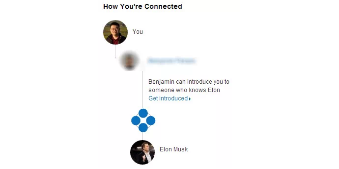 或者,如果你中意于特斯拉(Tesla)汽车的设计,而对创始人埃隆·马斯克(Elon Musk)产生浓厚的兴趣。说不定,你的朋友恰恰就认识埃隆·马斯克,而他就可以帮你和这个传奇的公司创始人和CEO建立某种联系。埃隆·马斯克出生在南非,18岁移民到美国,是全球最大的网上支付公司PayPal,SpaceX(空间探索技术公司),特斯拉汽车,以及SolarCity四家公司的CEO。