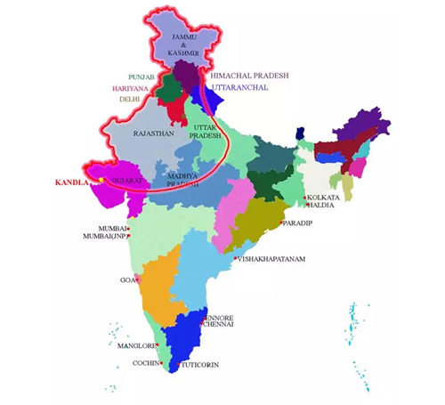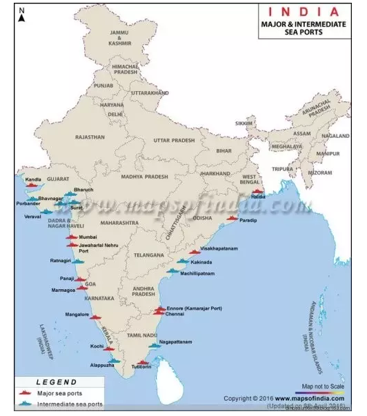 根据Map of India网站(www.mapsofindia.com)介绍,印度主要的港口有12个,但以下归成了11个。如图所示,自西向东分别如下: