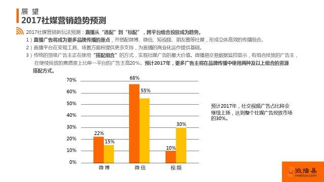 ◣ 2016年社交视频(含短视频和直播)异军突起,实际投放占比社媒传播高达10%,预估2017年这一数字可达到30%;