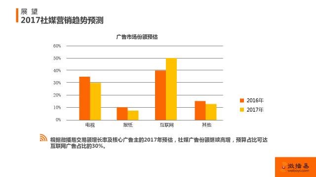◣ 预估2017年社媒广告将继续高增,预算占比可达互联网广告占比的30%;