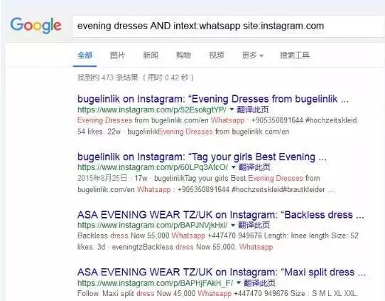 比方我们的关键词有evening dresses, wedding dresses,evening gowns等。在谷歌中搜索evening dresses AND intext:whatsapp site:instagram.com,结果如下图所示: