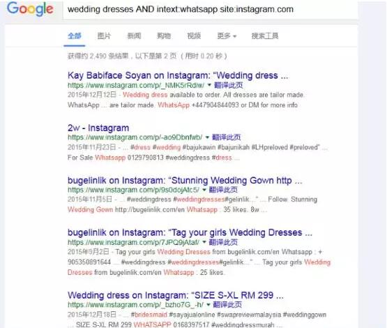 现在再换换个关键词,搜wedding dresses AND intext:whatsapp site:instagram.com,如果如下图所示: