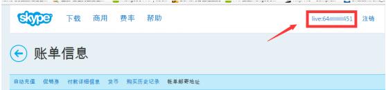 ▼进入后,查看页面头部,“live:64XXXX451”才是真正的skype帐号