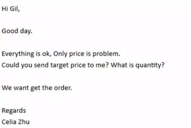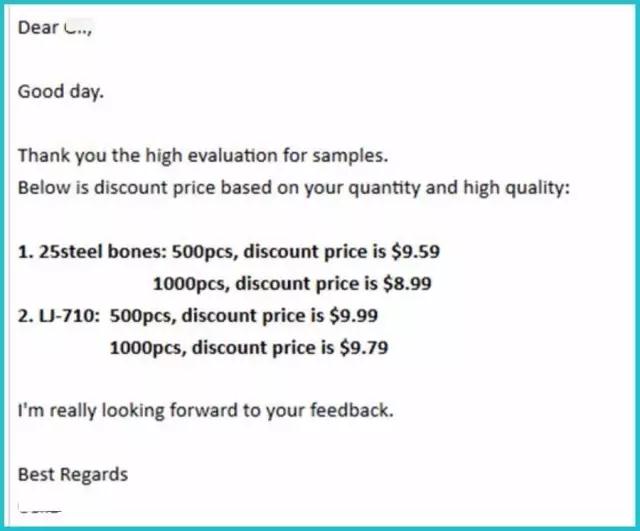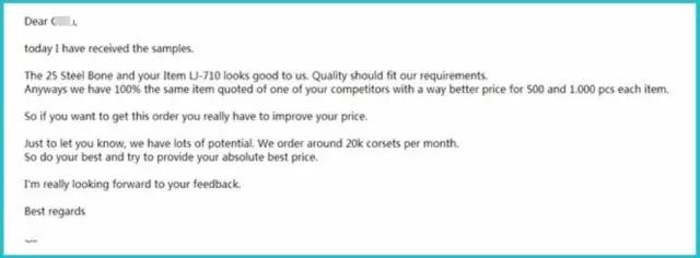 在这封邮件里,可以看到客户对于样品的质量很满意,但客户很精明,说他们有收到其他供应商更好的价格,同时还抛出了他每月的预订数量,给买方画了一个大饼。